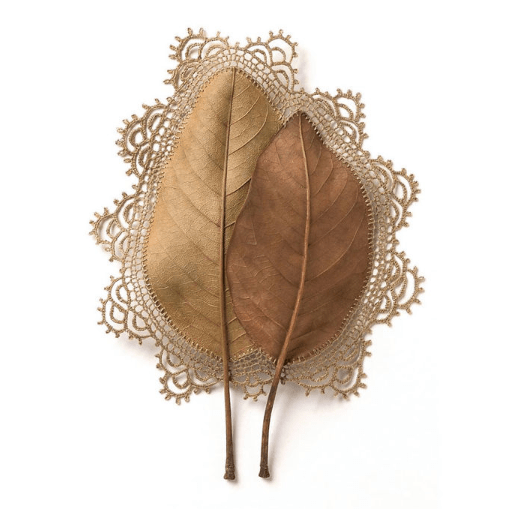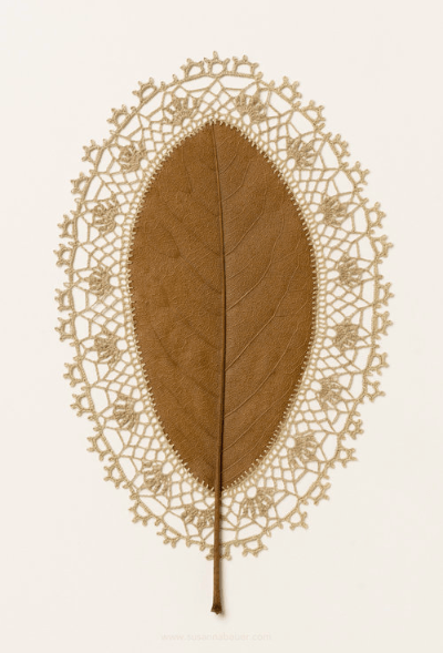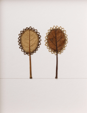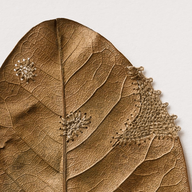 The stunning intricacy of Susanna Bauer’s crochet additions to dried leaves turns them from an ordinary, everyday sight into extraordinary artworks. The pair of leaves in Everything That Surrounds Us have been embellished with an ornate lace frame that resembles frames and mounts that adorn precious artefacts and artworks. Perhaps one can imagine Bauer’s embellished leaves placed in an old scrapbook with a collection of sepia-tone family portraits and yellowing hand-written letters. Although the artistry of the detailed lace frame turns the often-overlooked dried leaves into something that asks be admired (or at least paid attention to) the works still retain the simplicity and humility of the leaves themselves. Thinking of Bauer’s Leaf Works in terms of humility, a word that derives from the Latin humus meaning soil or ground, can help us understand what it is about these crocheted leaves that is so charming.