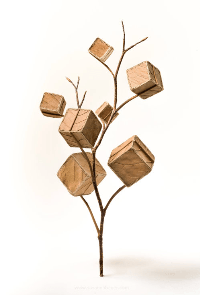 The distinction between what we find beautiful and what we find useful is akin to the somewhat antiquated categories of craft and fine art. ‘Craft’ is usually defined by an object’s utilitarian purpose (such as pottery, knitting, or quilting) and has often been seen as domestic, decorative, mechanical, minor, and feminine. ‘Fine art’, on the other hand, comprises all of what we would consider to be traditional art practices—painting, drawing, sculpting—which have been celebrated throughout history for their creative, intellectual, aesthetic, and imaginative qualities. Bauer’s Leaf Works inhabit the space between these categories (the boundaries of this space have recently been expanding and/or disintegrating at a rapid rate with an influx of contemporary art that uses the techniques and materials associated with traditional crafting: quilted ‘paintings’, knit sculptures, decorative ceramics, and the like). When considering Bauer’s materials, her works are fundamentally works of ‘craft’ in the sense that she uses crochet and found objects to create decorative (albeit use-less) objects. On the other hand, Bauer’s leaf compositions (those that have multiple, separate elements) such as Each Other and her three-dimensional artworks such as Cube Tree begin to resemble the ‘fine art’ mediums of painting/drawing/collage and sculpture/installation, respectively.